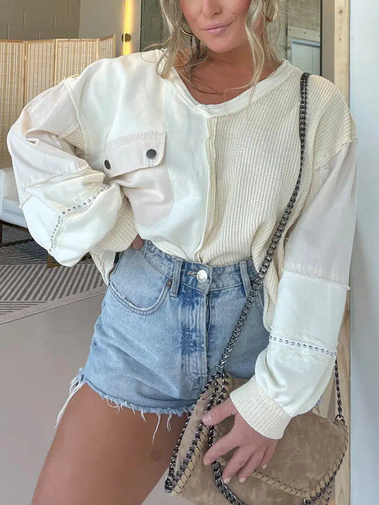 Elevate your casual wardrobe with our stylish Short Denim Color Matching Casual Sweater for women. Available in two timeless colors, Milky White and Blue, this pullover sweater is designed to offer both comfort and style. Made from high-quality polyester fiber, it features a regular long sleeve design that is perfect for layering or wearing on its own.